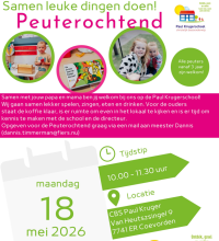Schoolnieuws Peuterochtend 18 mei Peuterochtend maandag 18 mei van 10.00 - 11.30 uur. Samen leuke dingen doen. Spelen, zingen, eten en drinken. Kom jij ook? Graag van te voren opgeven via de mail. Voor meer informatie klik op deze link Terug